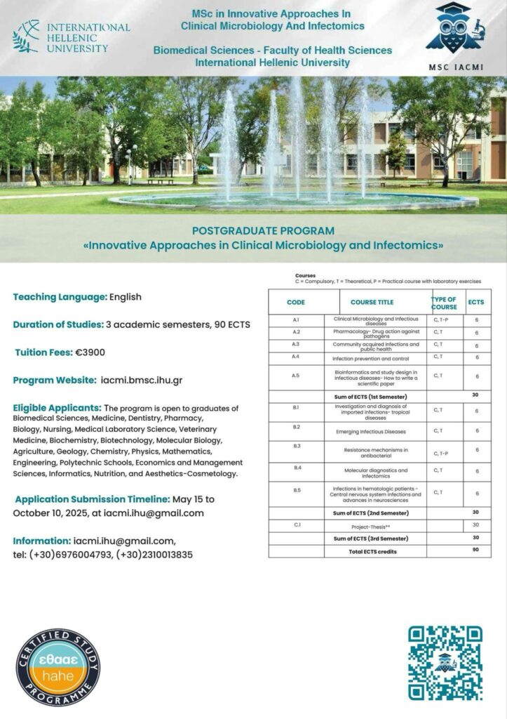 για το ακαδημαϊκό έτος 2025-2026 από 15 Μαΐου 2025 έως και 10 Οκτωβρίου 2025, στο Αγγλόφωνο ΠΜΣ «Innovative approaches in Clinical Microbiology and Infectomics» του Τμήματος Βιοϊατρικών Επιστημών της Σχολής Επιστημών Υγείας του Διεθνούς Πανεπιστημίου της Ελλάδος. Το μεταπτυχιακό διδάσκεται σχεδόν εξ ολοκλήρου διαδικτυακά στην Αγγλική γλώσσα με διδάσκοντες μέλη ΔΕΠ από Πανεπιστήμια της Ελλάδας και του εξωτερικού.