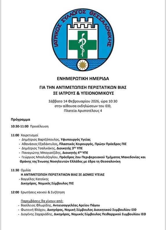 Ημερίδα του Ιατρικού Συλλόγου Θεσσαλονίκης Σάββατο 14 Φεβρουαρίου, στις 10.30 πμ στα κεντρικά γραφεία του ΙΣΘ στην Πλατεία Αριστοτέλους 4, για την αντιμετώπιση περιστατικών βίας σε βάρος γιατρών και υγειονομικών